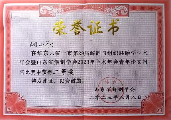 本次学术年会组织了“青年论文报告比赛”,共有29名师生分别从神经生物学、发育生物学、干细胞与组织工程、临床解剖学、解剖学与组织胚胎学教学研究和形态学实验研究等方面进行了青年论文报告比赛。我校欧冠官网组织学与胚胎学教研室胡小冬老师参加了此次年会并进行青年论文报告比赛。胡老师结合《医药学基础》课程教学探索与实践向参会师生作了报告。她从如何坚持“育人先育己,正己后正人”,抓牢教师队伍“主力军”培养,打造一支思想觉悟高、思政能力强的教师团队,以及在课程建设“主战场”发挥课堂教学“主渠道”作用,协调发展“科研育人”和“文化育人”的教学实践介绍了课程育人的经验和成效。论文经专家综合评比荣获二等奖,展示了我校教师的优秀风采。