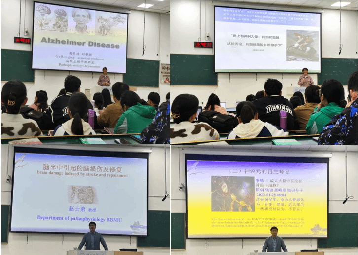 为助力研究生思想教育,进一步提升研究生培养质量,欧冠官网继续推进究生课程思政示范课堂建设,坚持示范引领,强化研究生课程育人功能。继暑期和11月7日开展4次研究生课程思政公开课教学活动后,于11月13日和14日在T4和T2教室再次开展研究生课程思政公开课活动,主讲教师分别是病理生理学学位点《医学神经生物学》课程思政示范课程教学团队成员赵士弟教授和葛荣靖副教授,内容分别为《阿尔茨海默病》和《脑卒中引起的脑损伤及修复》。学院领导、学位点教师和学院部分教师现场观摩。