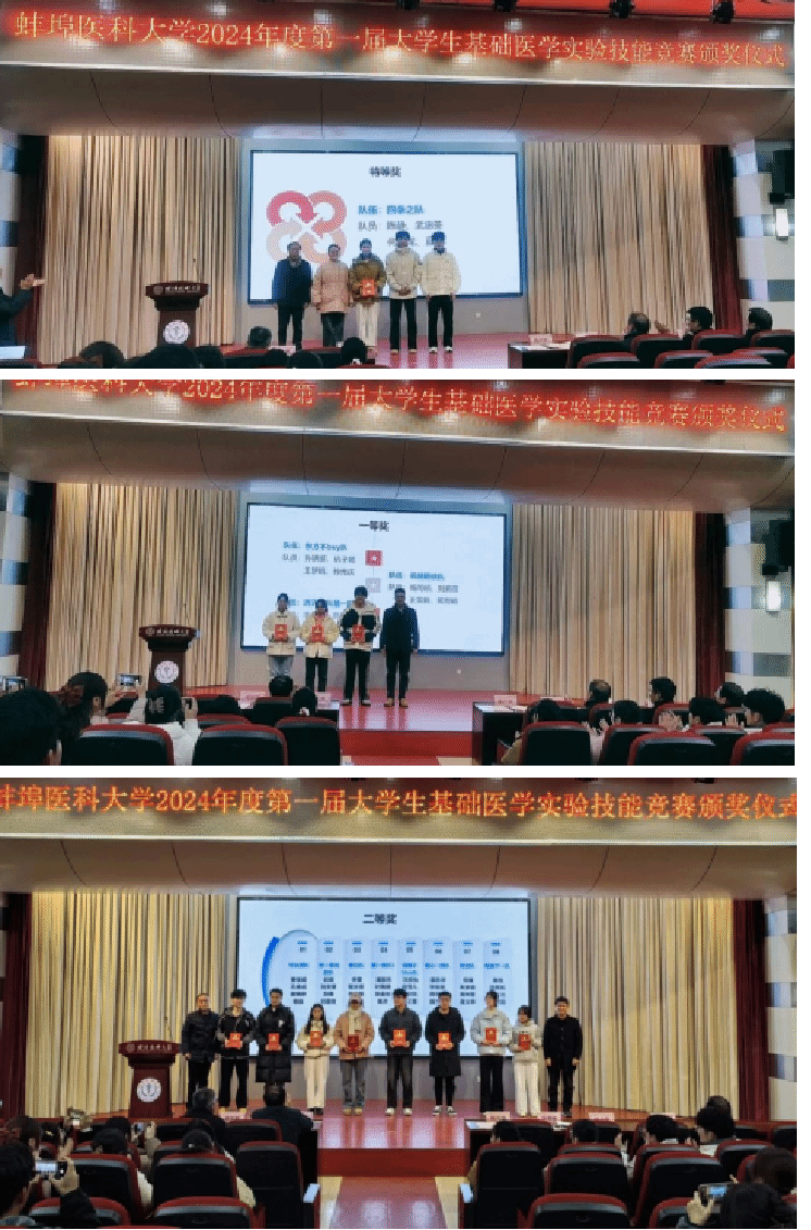 12月12日,我校在学术报告厅举办蚌埠医科大学2024年度第一届大学生基础医学实验技能竞赛表彰大会,学校副校长陈昌杰、教务处处长童旭辉、副处长赵士弟、欧冠官网书记单增强和院长陈兴智出席颁奖仪式。