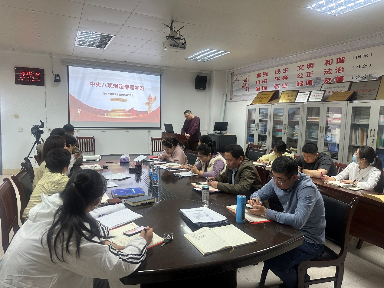 4月16日上午,基础医学院微生物学党支部以“支部书记讲党课-引领作风建设新实践”为主题,开展深入贯彻中央八项规定精神学习教育专题学习。会议由党支部书记张涛主持,全体教工党员和研究生党员参加学习。